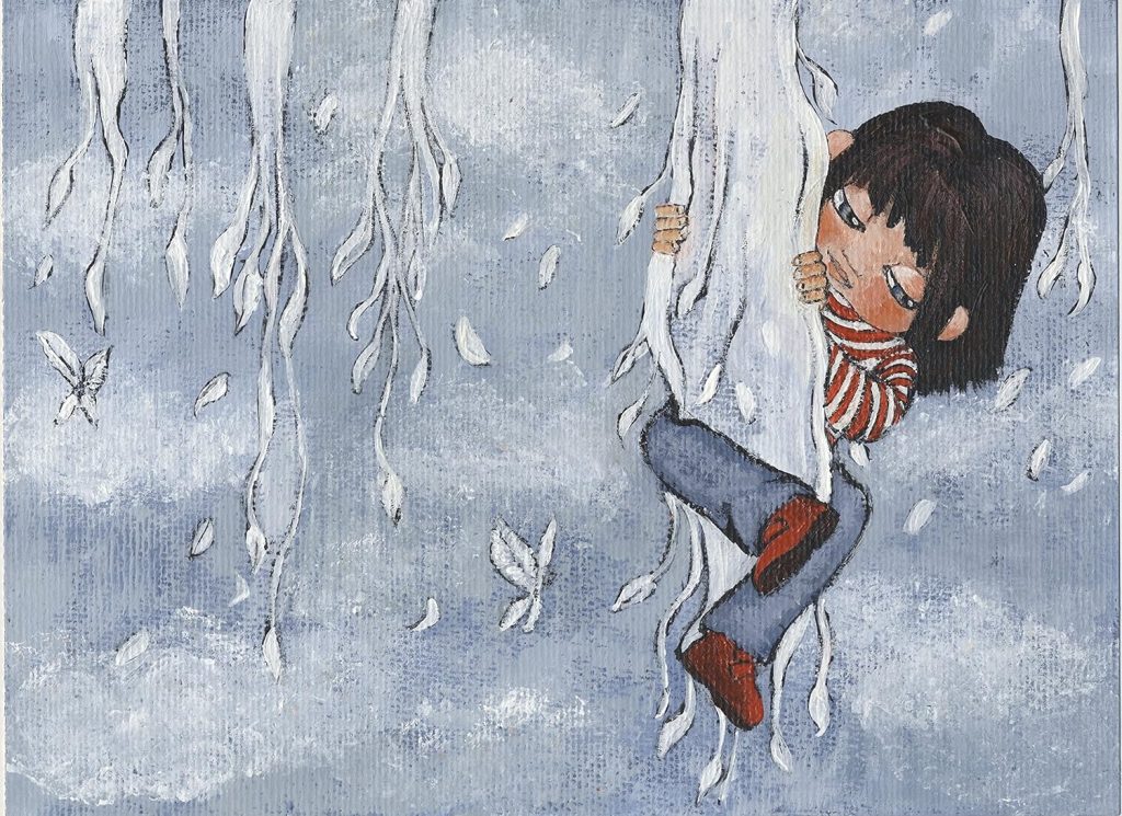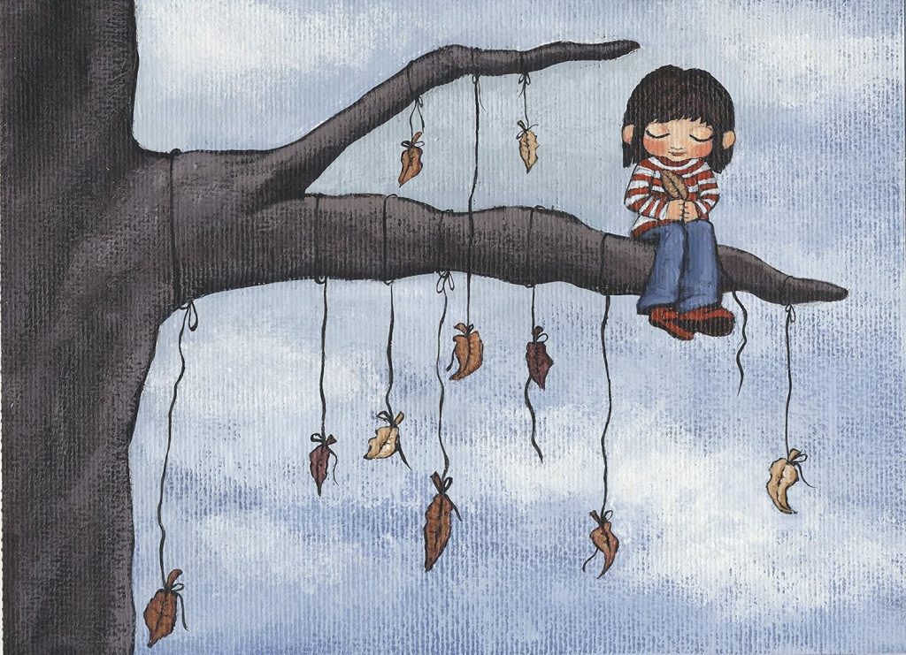 La protagonista es una niña que, en un principio, no quiere aceptar que el otoño ha llegado, pero, poco a poco, descubre que este cambio no es una catástrofe (árboles sin hojas), sino una mutación que puede ser fascinante (las hojas tienen alas, son peces, bailan, son libres…)